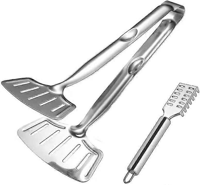 Multifunctional and flexibleGrab and flip food! Can be used for steak, fish, burgers, pizza, etc., these multi-purpose cooking tongs hold the food firmly and can be easily flipped in just one step. Unique DesignThe groove design at the handle is more in line with your usage habits, easy to use and non-slip, the wide flat head design can better grasp the food, easy to turn over, the grooved design of the shovel pliers can filter excess oil, let the food Healthier and tastier. Multiple ApplicationsBasic kitchen utensils, perfect for basic kitchen tasks, in addition to the multi-functional spatula tongs, a fish scale scraper with a serrated tip is provided, and the fish scales will peel off immediately with just one touch, safe and reliable. Material SafetyThe material of the multifunctional fish tongs and fish scale scraper is food grade, made of high quality 304 stainless steel, heat resistant up to 800/1472. Dishwasher safe and easy to clean by hand. Easy to storeEach cooking tong is equipped with a Velcro strip to tuck the tongs so that the tongs can be closed together for easy storage.Products from KJ's store