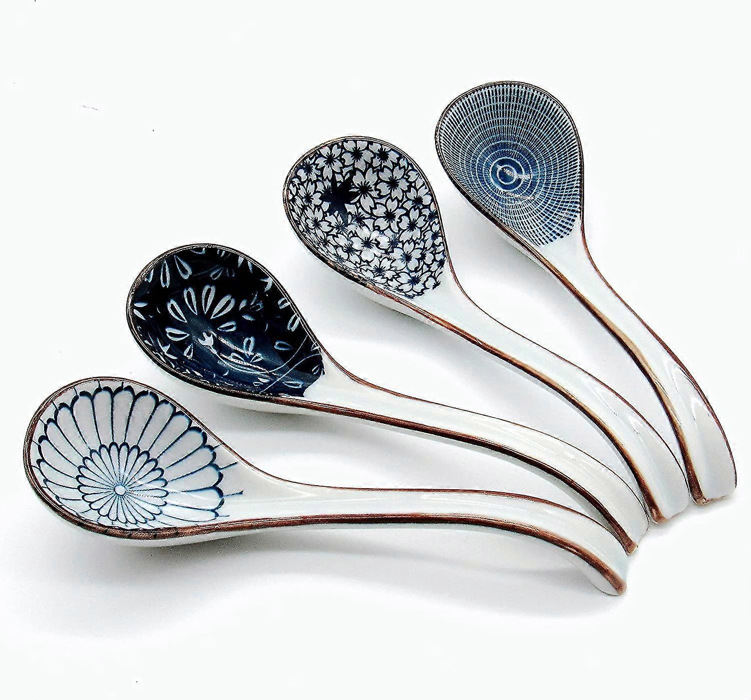 Asian Soup Spoon,6.4inch Japanese Pho Spoon With Long Handle For Miso(blue And White Porcelain,4pcs)