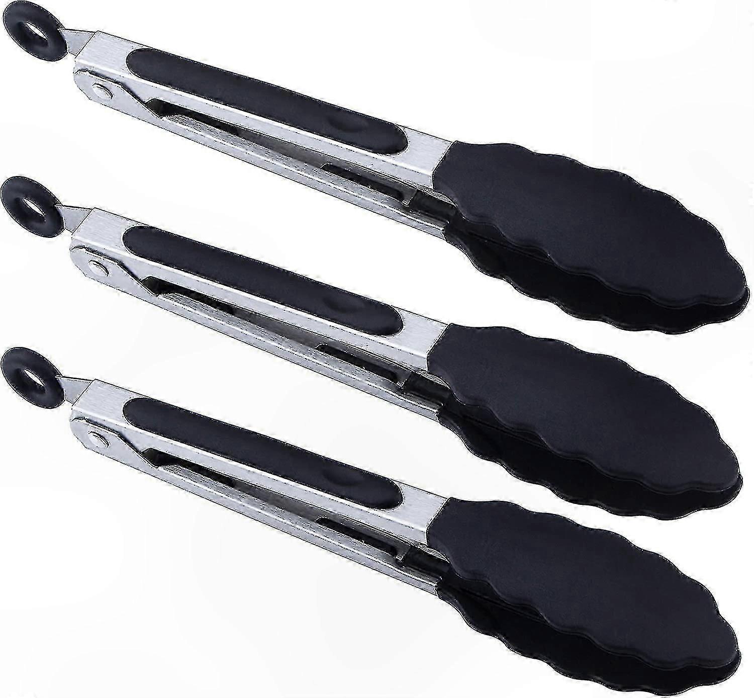 Mini Silicone Kitchen Tongs - 7" Serving Utensils Set of 3 - Black Heat-Resistant Cooking Tools