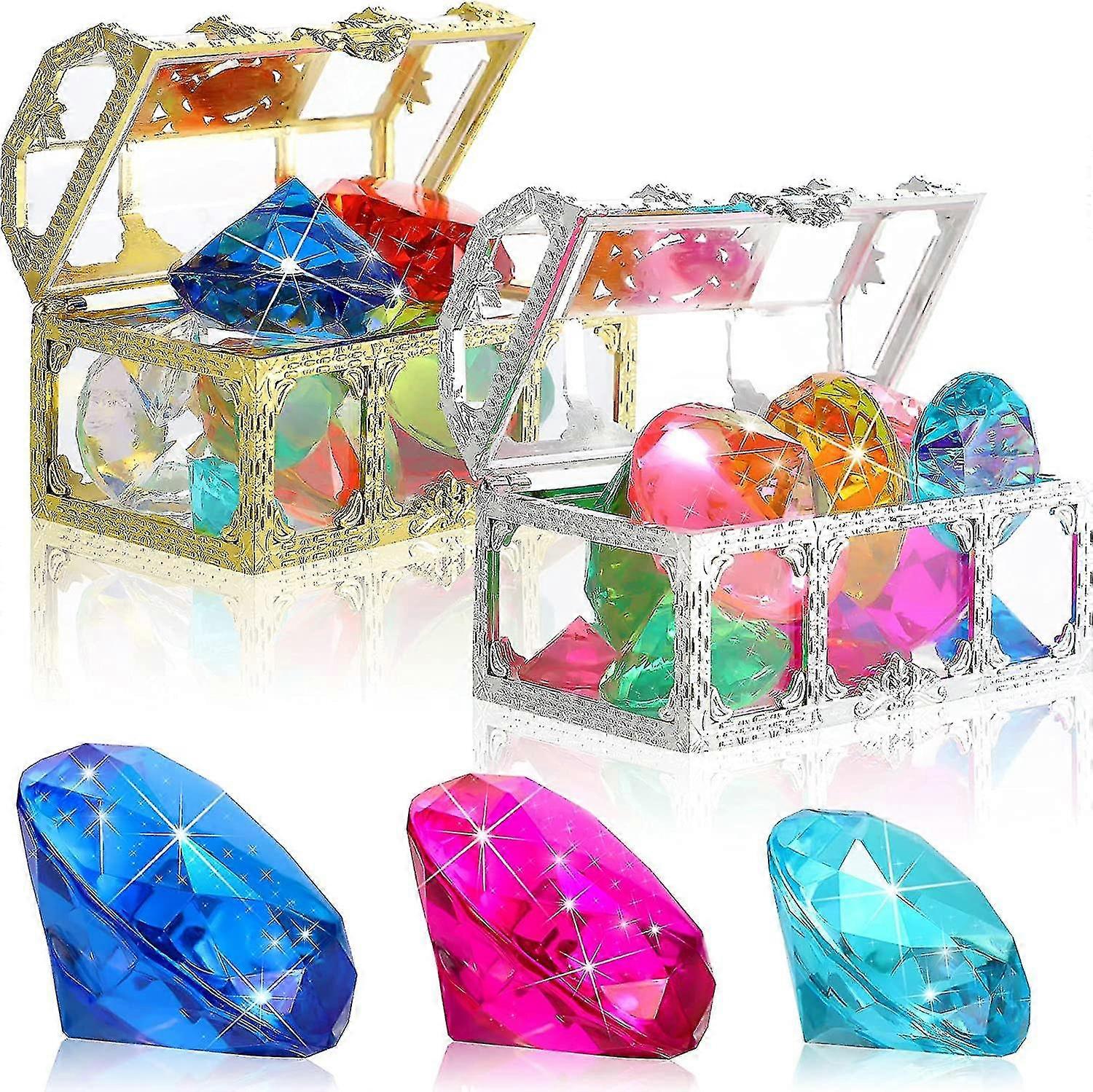 Joyful toys set: each swimming toy set contains 12 pieces gems, 3 large (40 mm), 4 medium (30 mm) and 5 small (20 mm) gems, 2 set (24 pieces) gems in total, and comes with 2 vintage mini treasure pirate boxes, one silver and one golden treasure pirate box, its size is about 90 x 52 x 55 mm Quality material: the colored diving gems pool toy are made of resin, non-toxic, harmless, non-fading, ideal weight, can sink well into the swimming pool, durable, good texture, high temperature resistance and long service life Exquisite appearance: these diving gem are colorful, which is easy to attract people's attention when playing games in the diving pool, put these diving toys diamonds in a pirate box, so that you and your friends can start a treasure hunt Active guidance: these diving gems are good for summer swimming pools, encourage teens and young people to dive, make them like swimming, and take more initiative to exercise Wide range of occasions: diving gem pool toy set are fit for decoration in various places such as summer parties, pool parties, beach parties, birthday parties and diving toy school activities, as well as vase filling, table scatters and wedding site decoration, etc.
