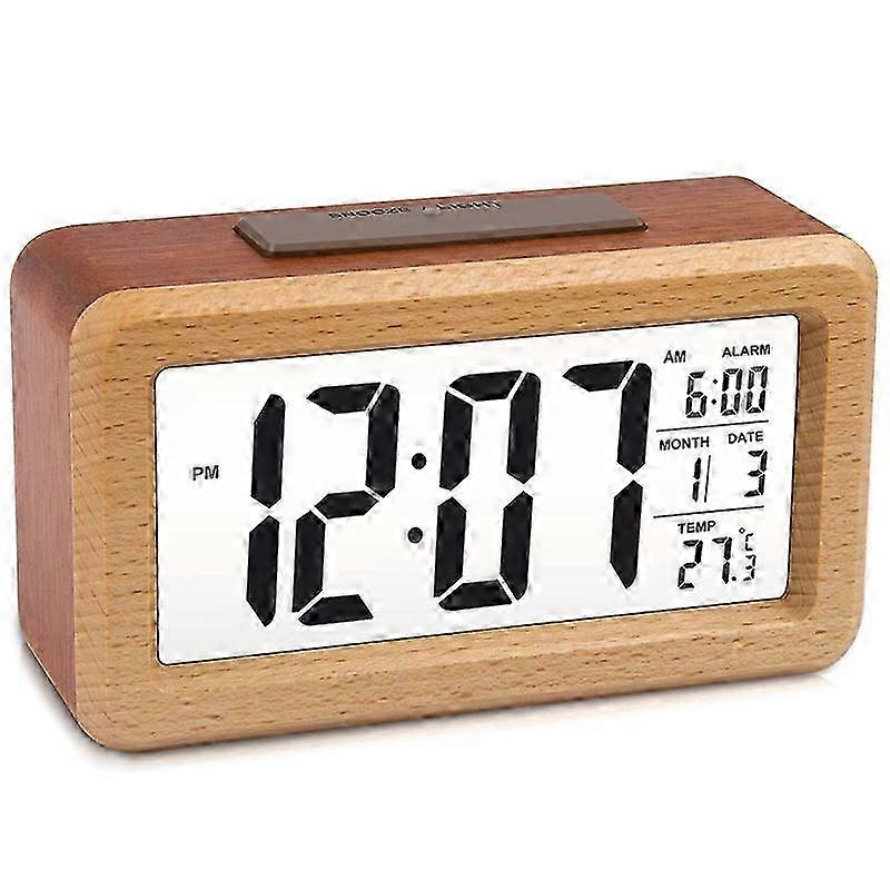 Wooden Large LED Digital Alarm Clock, Smart Sensor Night Light with Snooze, Date, Temperature, 12/24 Edition 0709