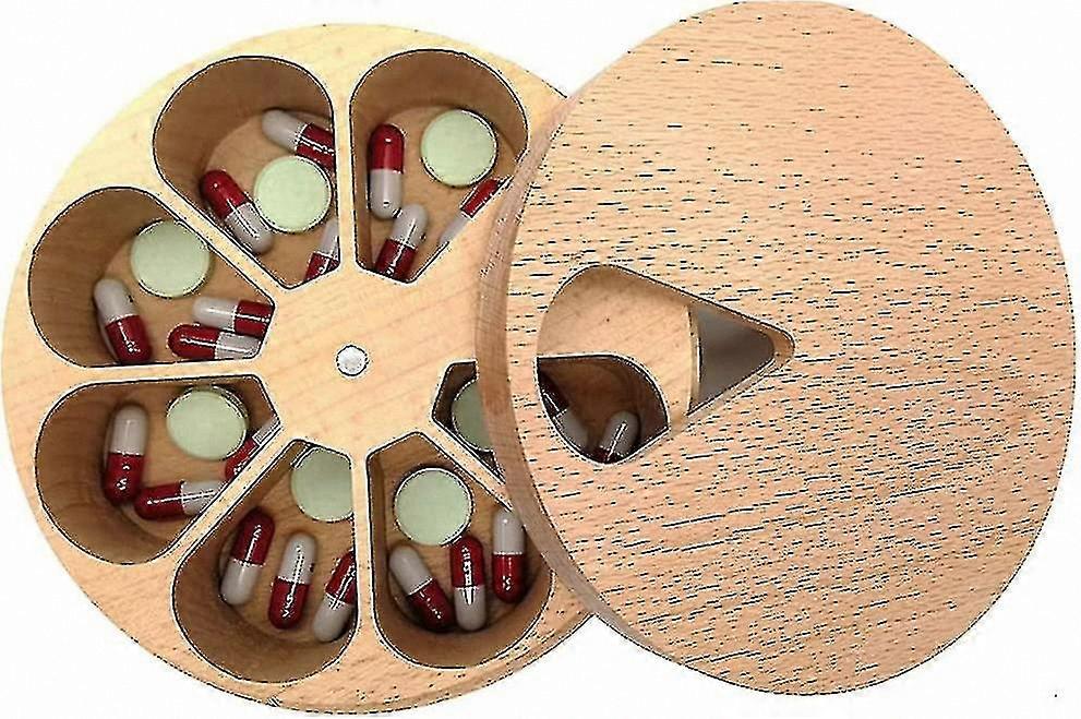 7-Day Wooden Pill Organizer, Portable Round Medicine Box with Lid, Vitamin Storage Tray
