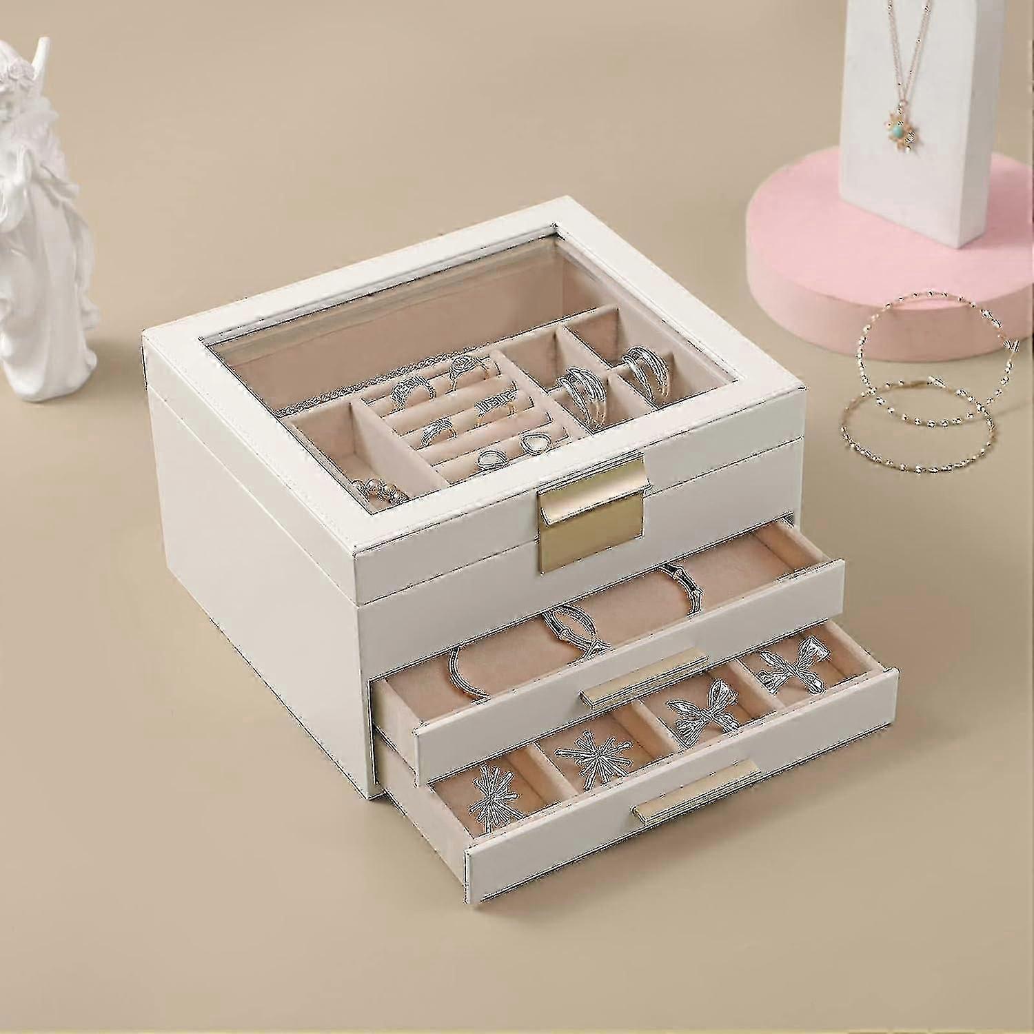 Jewelry Box Organizer For Women,3 Layers Jewelry Storage Display Box With Glass Lid, Large Capacity