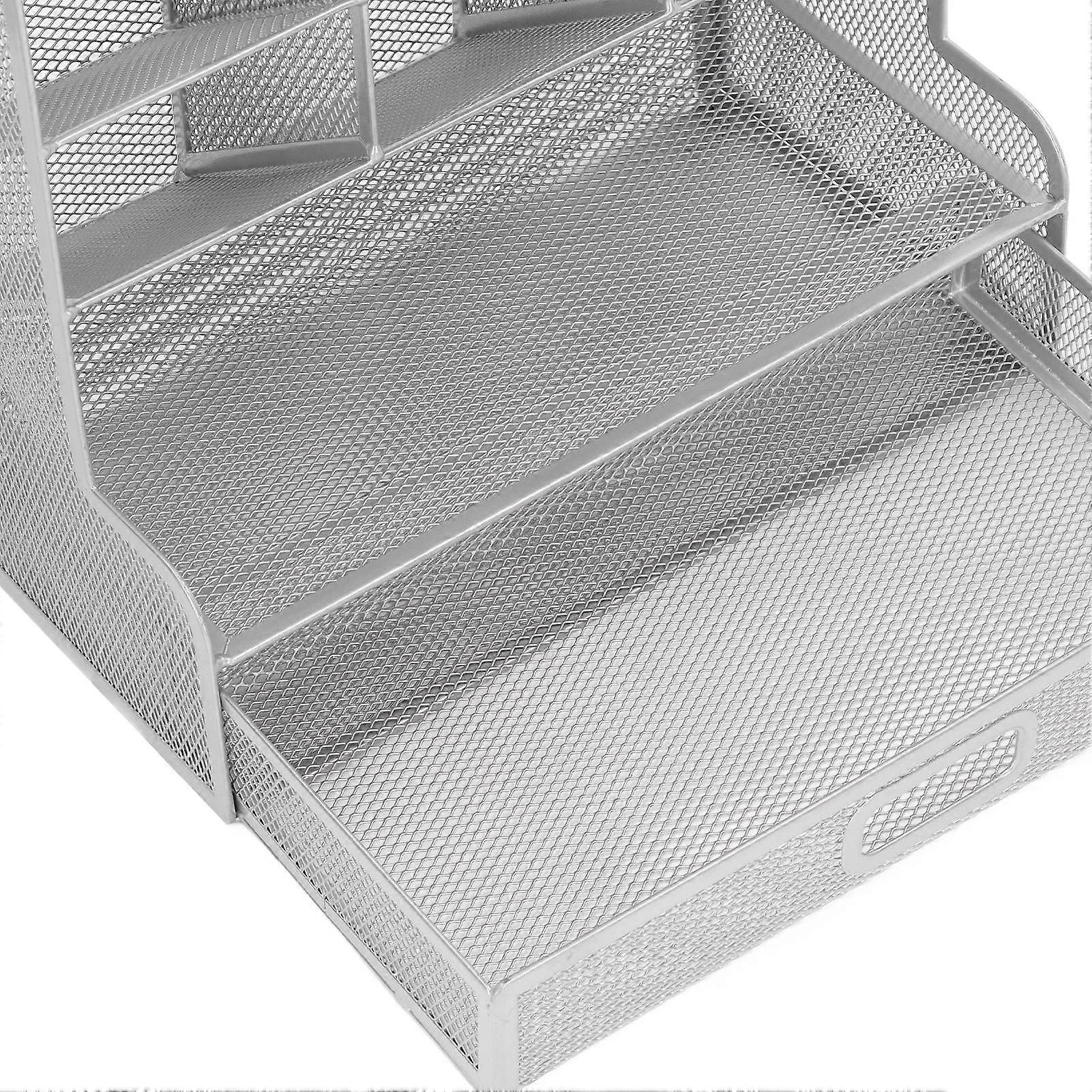 Mesh Pen Organizer 9 Compartments with 1 Pull Out Drawer Upright Storage Iron Multi Functional Pen Holder for Rulers Silver