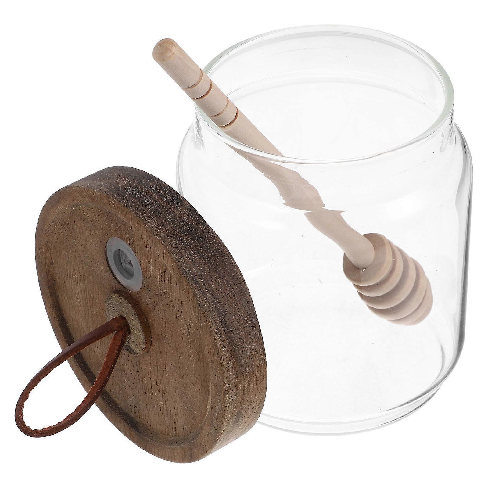 Honey Jar Holder Dispenser with Wooden Lid Dipper Stick Syrup Container 1 Set for Home Kitchen Clear Decanter Condiment Holder