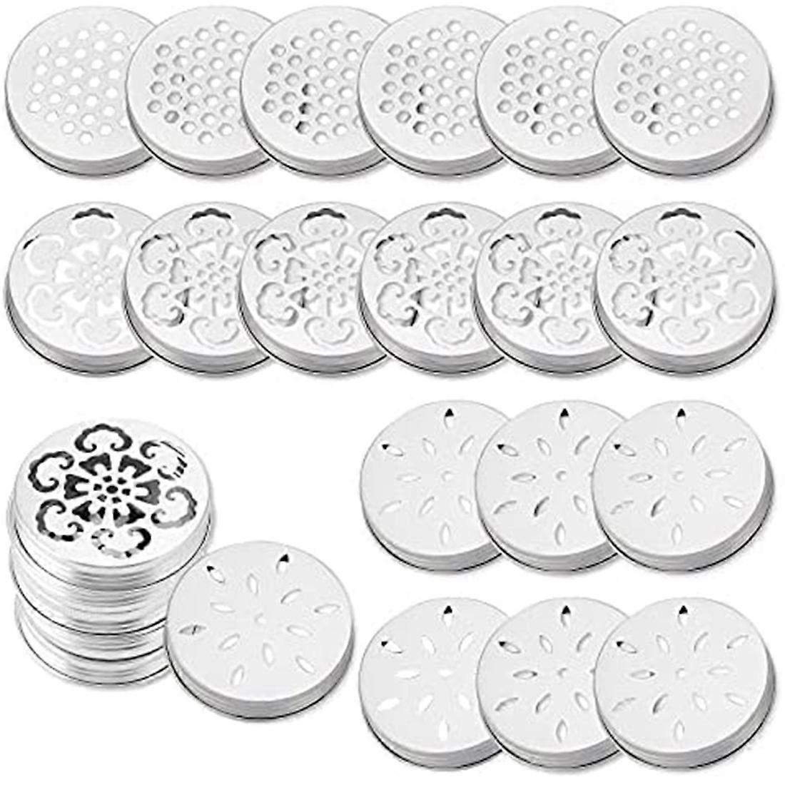 Standard Mouth Mason Jar Lid: : about 7cm/ 2.75inch in diameter, 6.6cm/2.6inch inner diameter. They fit perfectly on a standard mouth sized mason jar, NOT for other small mouth mason jar. 3 Style Hollow Mason Jar Lids: Hollow , leaf, snowflake design, 10pcs each design, 30pcs totally - enough for your and beautiful design turns your mason jar lids into thoughtful decor. Mason Jar Candle Topper: When used with a mason jar candle, they airflow and help it burn more evenly and , moreover these sculpted metal candle accessories add a distinctive, refined touch to any setting. Easy to : They work and they fit over and hold in place the flat seals for the lid. Decorative open hole lid which lets scent out of jar. Perfect to make scented gift jars for Christmas gifts. You can also for table decor with flowers. Wide Usage: These versatile lids are great for candles, scented potpourri, crafts, home decor, oil diffusers, bath salts, fresheners. Looking to add a little to your home decor. Colour:silver Material:Metal Package Contents: 30 x Mason Cover Only the above package content, other products are not included. Note: Light and different displays may the color of the item in the a little different from the real thing. The measurement allowed error is +/- 1-3cm.