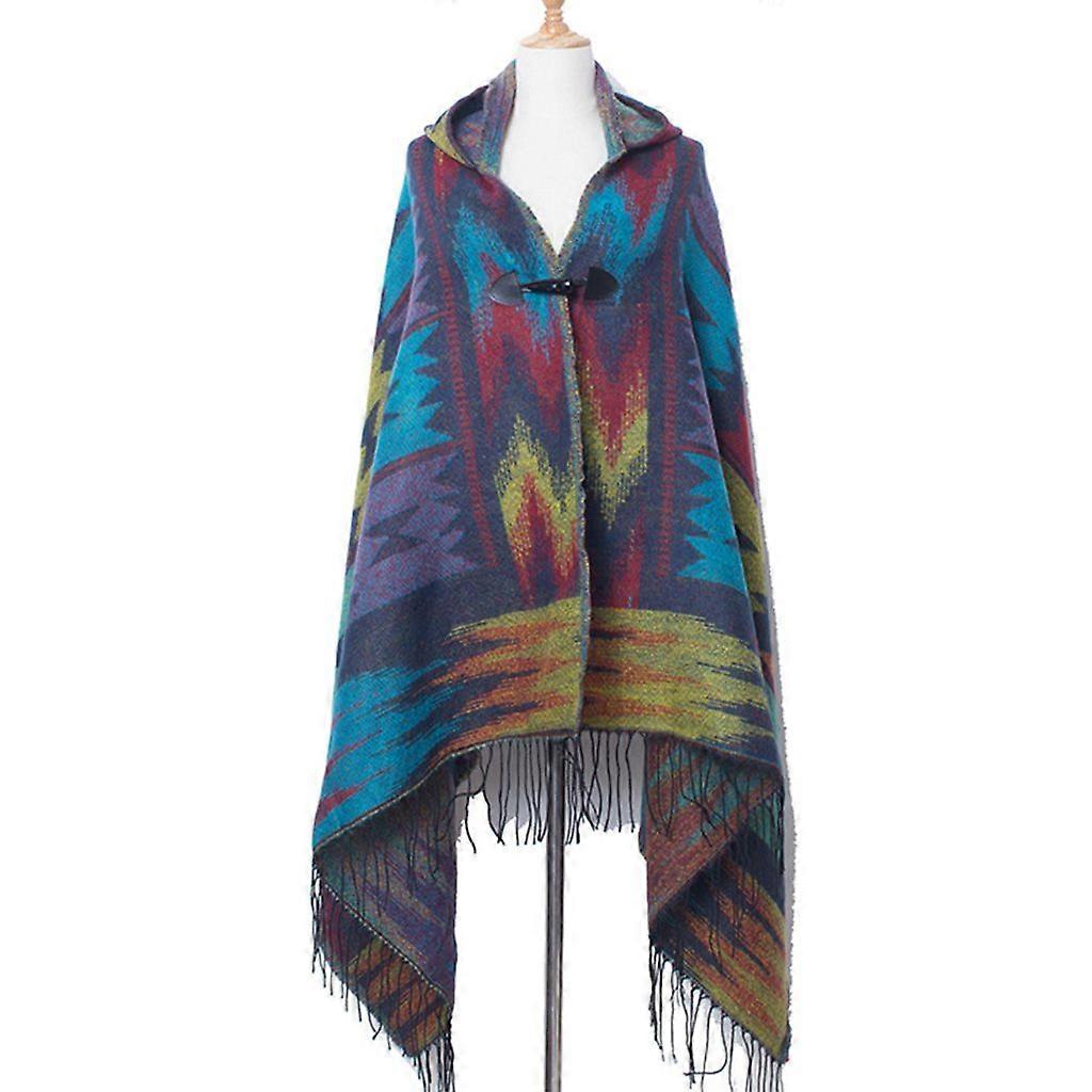 Women Bohemian Ethnic Hooded Poncho Tassels Shawl Cape Geometric Patterns Loose Cloak Scarf Cardigan with Horn Button