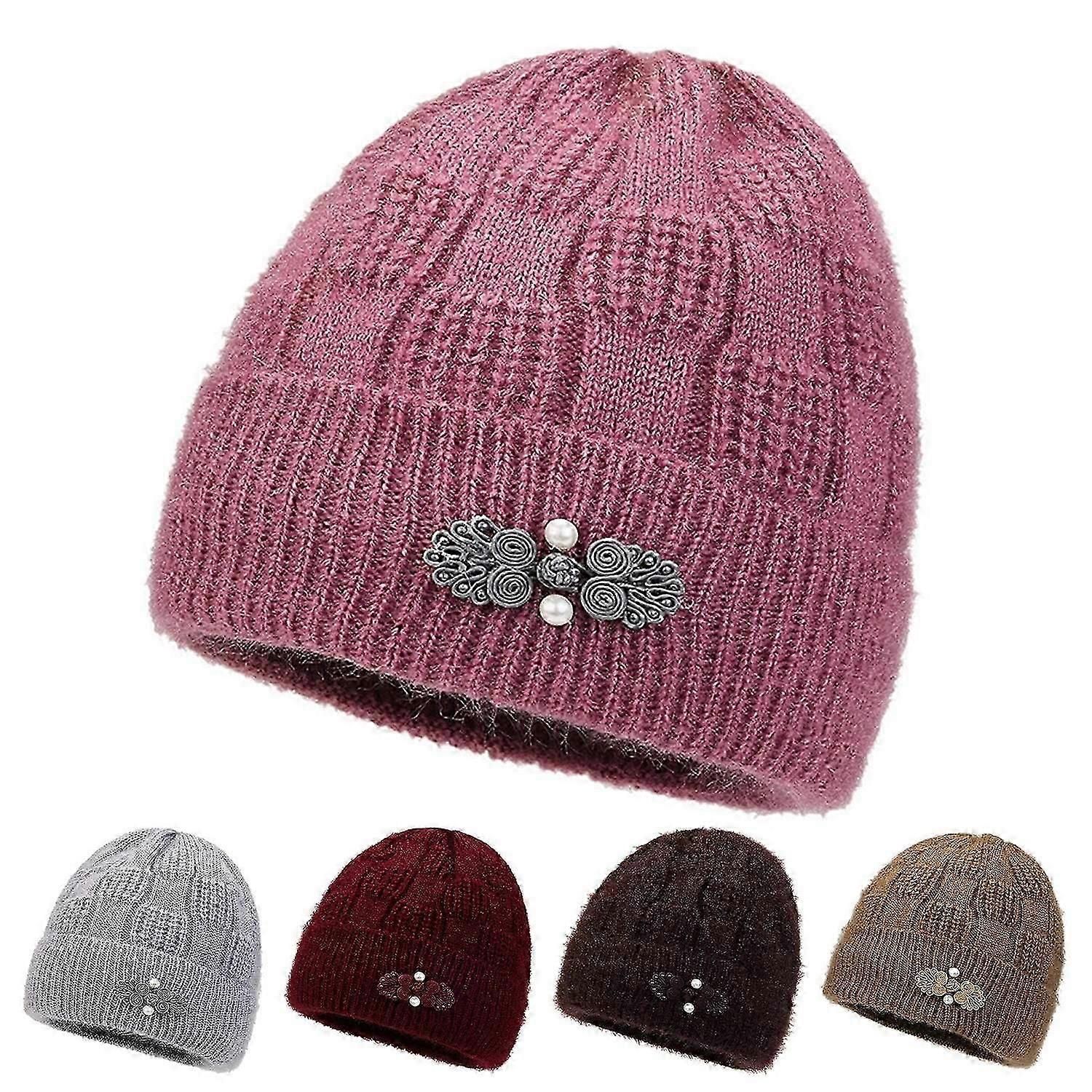 Mid-aged Women Winter Hat Flower Applique Decor Dome Knitted Stretchable Beanie Solid Color Brimless