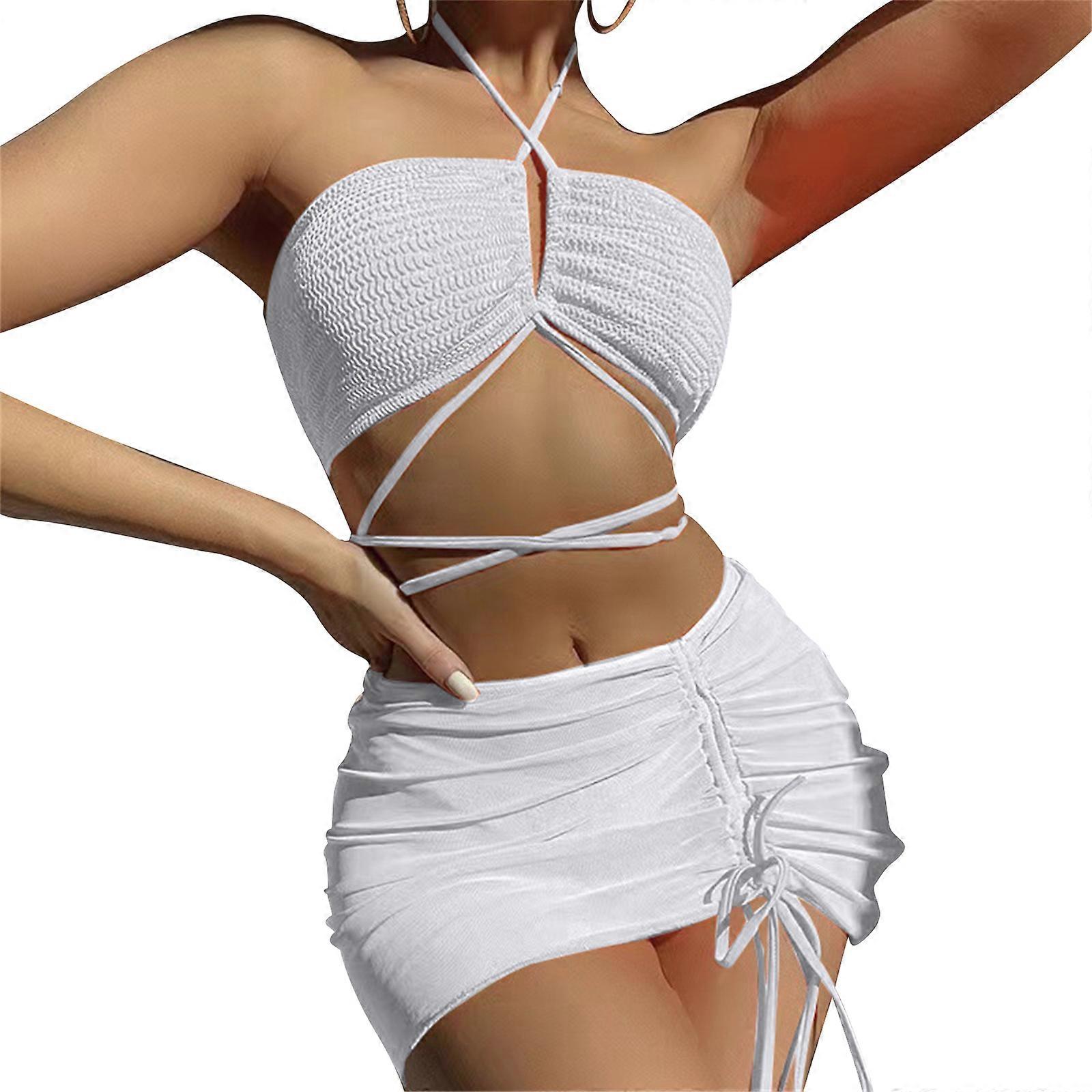 Womens Lace Up Swimsuit Ladies 3 Pieces Bathing Suits Solid Color Halter Triangle Bikinis Set with Beach-Skirt Beachwear White S
