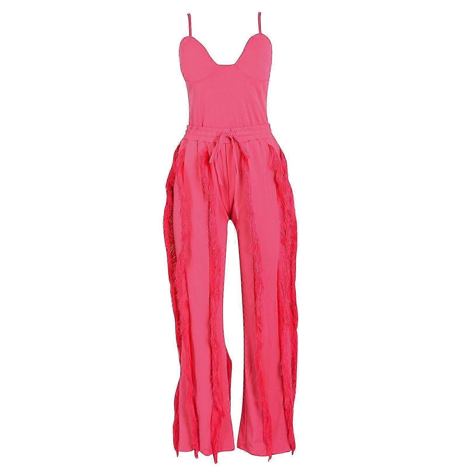Women's Summer Jumpsuits Casual Sleeveless Fringed Tassels Bodycon Long Pants Jumpsuit Drawstring Waist Rompers rose Red XXL