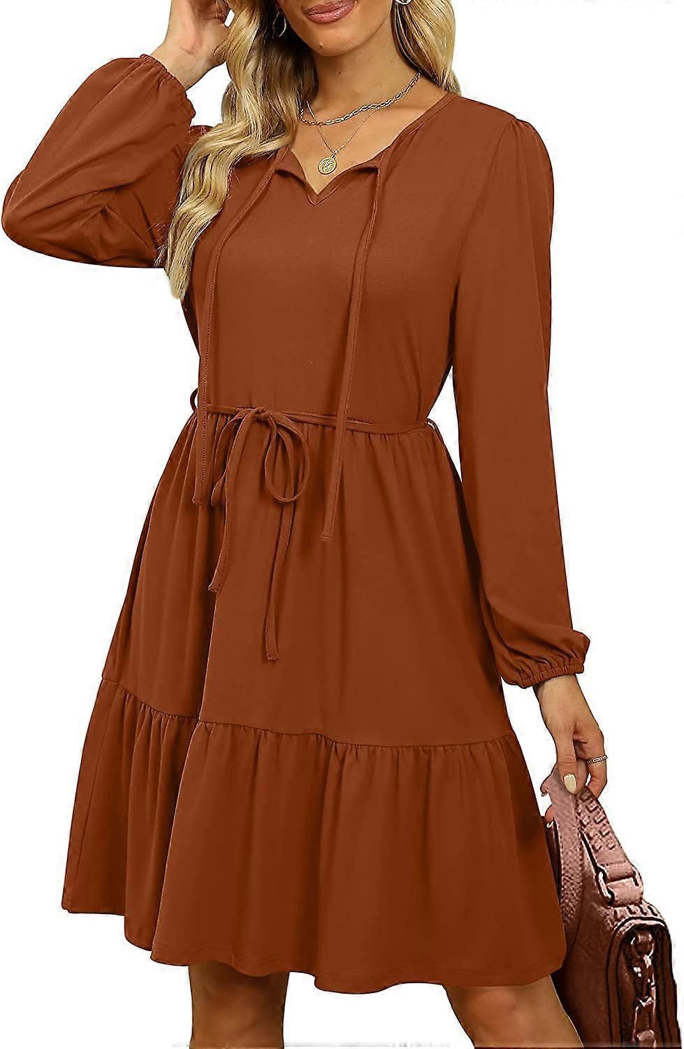 Women's Fall Dress Casual Long Puffy Sleeve Ruffle Knee Length Dresses with Tie Waist S-2XL