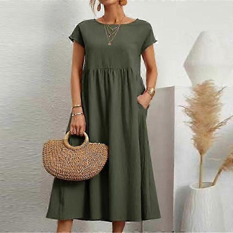 Women's Casual Short-Sleeve A-Line Dress with Pockets Cotton Linen Office Wardrobe Style 24647