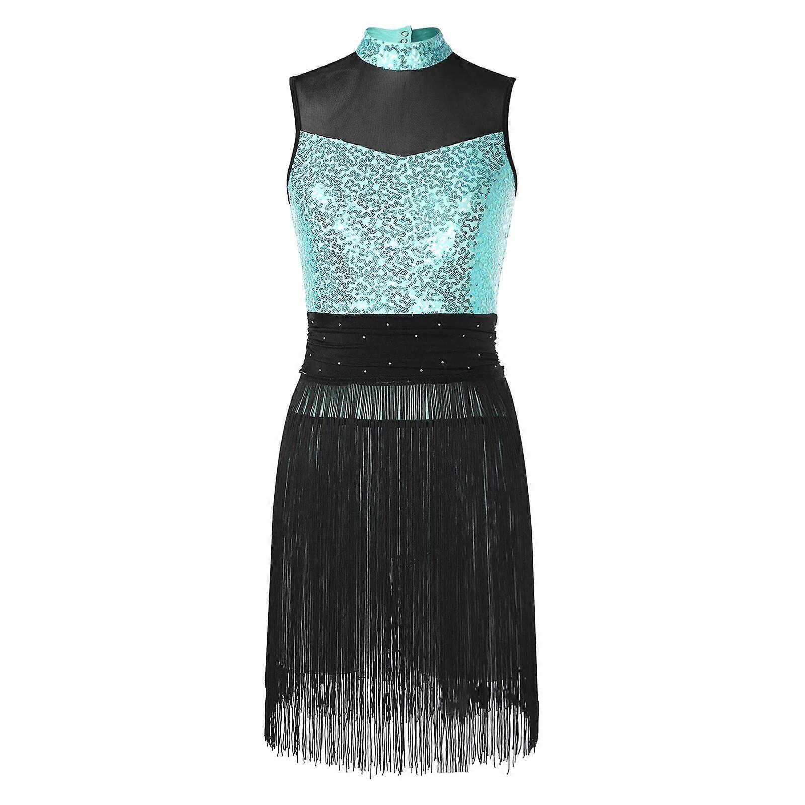 Womens Fringed Glittery Sequins Latin Dance Costume Sheer Mesh Patchwork Tassel Leotard Dress for Samba Tango Cha-Cha Jumpsuit