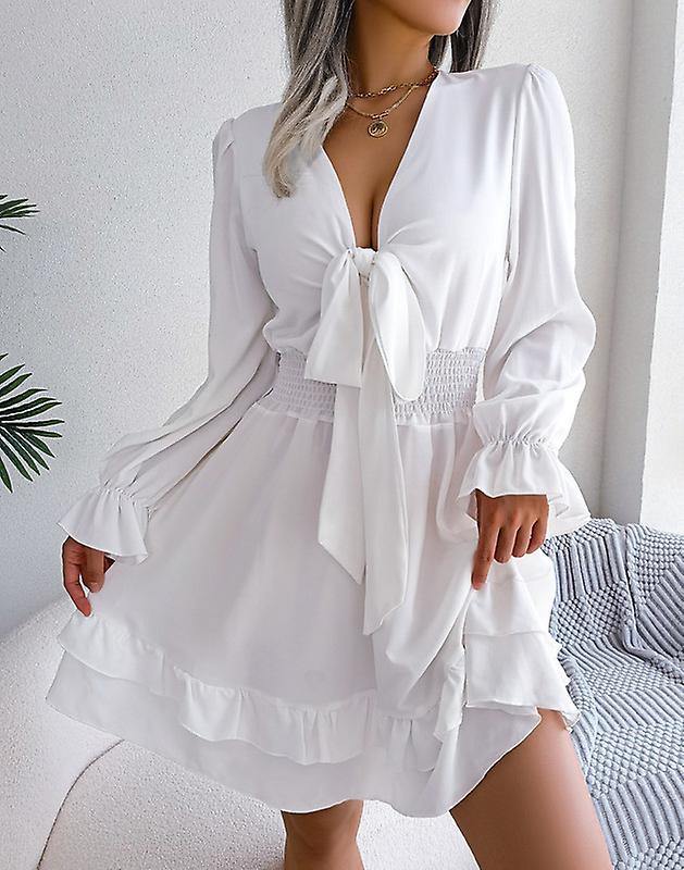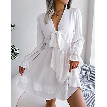 Womens 2023 Summer Deep V Neck Knotted Tiered Chiffon Elegant Mini Short Swing Skater Dresses