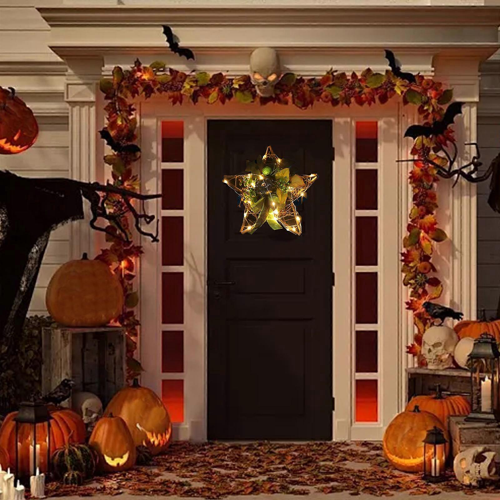 Halloween Wooden Pentagram Pumpkin Wreath LED Lights Decoration Artificial Silk Flower Pumpkin Berry Decoration Thanksgiving Christmas Halloween Holid