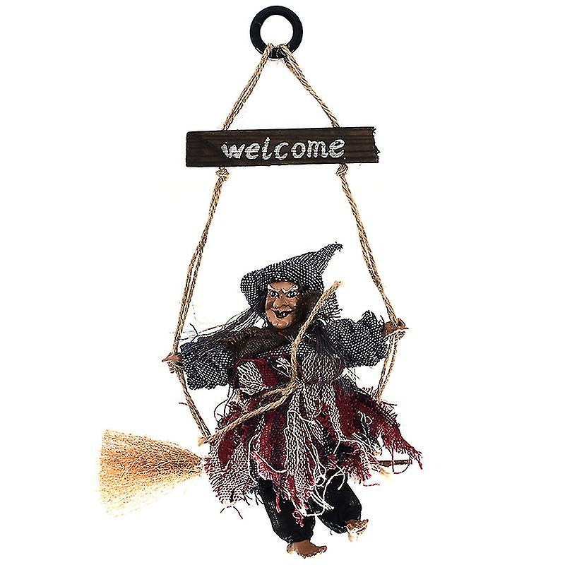 Halloween Hanging Witch Decoration, Witch On Broom With Welcome Wood Plaque For Haunted House Decor, Indoor Outdoor Halloween Party Ornament ( uu