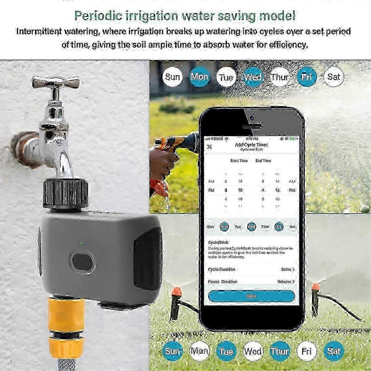 SMART CONTROL: Bring intelligence to your yard by turning any outdoor faucet into an app-controlled water source that can help you save time, water and money. You can control your timer from your phone at any time, anywhere, simplifies your irrigation work. And the SMART WATER TIMER allows you to schedule watering based on weather conditions. (Only support 2.4Ghz WiFi) SHARED HOME IRRIGATION MANAGEMENT: Smart Living App can be shared with your friends or family. You can add family members to control the timer together. If you don't have time, they can change the settings RAIN DELAY: In order to avoid unnecessary watering, you can temporarily suspend your watering program for up to 24H, 48H, 72H using the rain delay feature, after the delay is over, your watering program will automatically resume EASY TO INSTALL AND USE: Setup is straightforward and simple, just download and install the Smart Life app, create an account, and then install your timer at your hose faucet to start using your timer AND WEAR RESISTANT: Hose are made of IP55 waterproof impact plastic and UV resistant silicone material, perfect for outdoor garden use. Can be left outdoors for a long time without damage WiFi water sprinkler , building an intelligent irrigation system for your garden and taking over the watering tasks of the garden. In addition, you can add family members to the application and share household irrigation management. Colour:As Shown Material:ABS Plug Type :EU Plug,it applies to Indonesia, Germany, France, Spain, Italy and so on. Voltage: AC100-240V Power supply: 4 X AAA batteries (not included) Package Contents: 1X WiFi Smart Water Timer 1X WIFI gateway 1X adapter 1X Sealing tape 1X English manual Only the above package content, other products are not included. Note: Light reflection and different displays may cause the color of the item in the picture a little different from the real thing. The measurement allowed error is 1-3cm. Note: Due to the light and screen setting difference, the item's color may be slightly different from the pictures. Please allow slight dimension difference due to different manual measurement. Sold by-DIMEANI official store