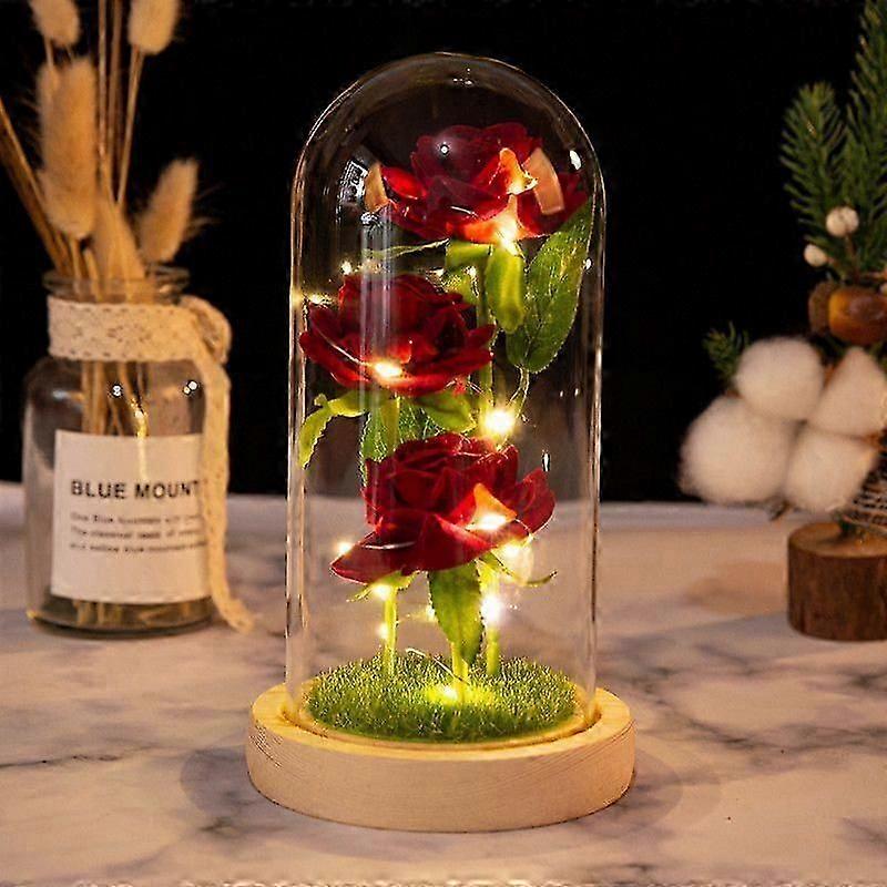 Beauty and The Beast Rose,3 Red Silk Rose in Glass Dome with Warm Light,Artificial Flower Light up Rose,Handmade Rose Tube Gift for Women on Anniversa