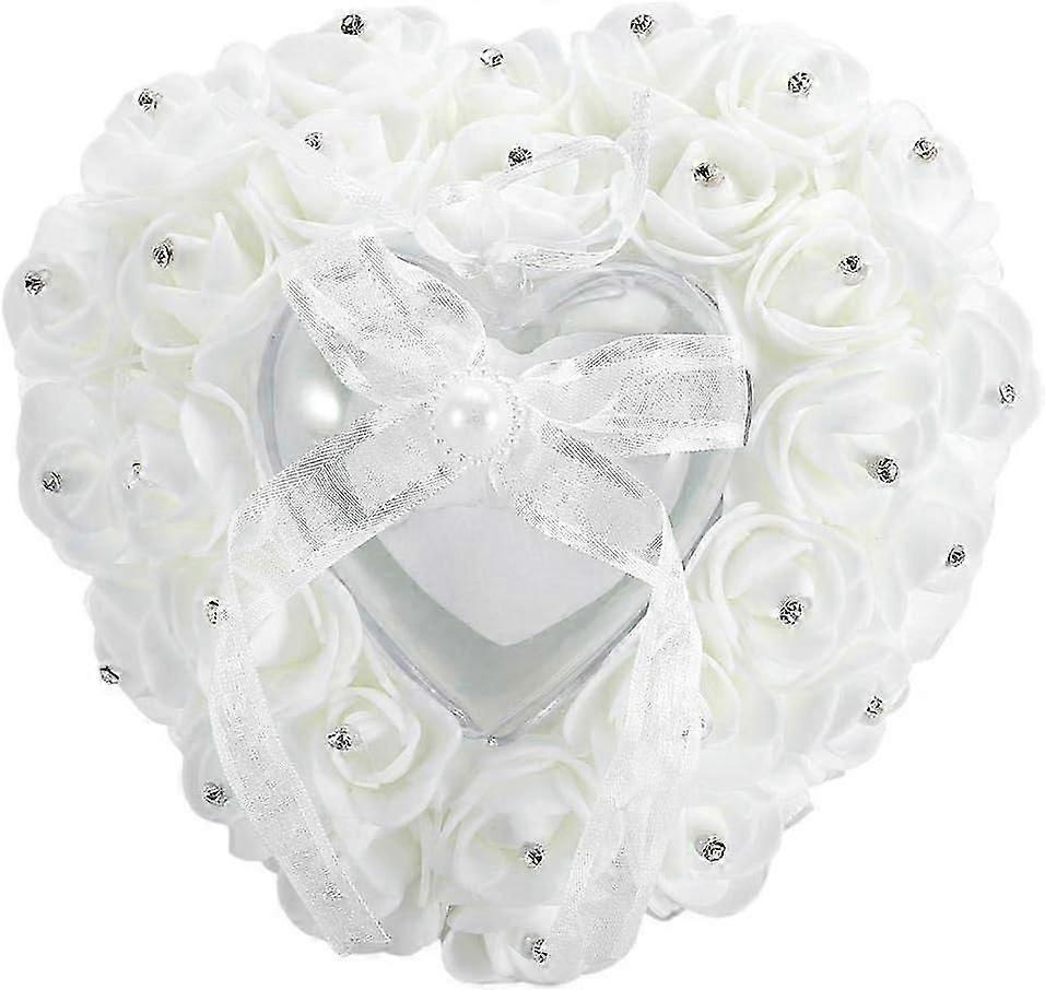 Ring Pillow - Heart-Shaped Wedding Ring Box with Rhinestone Decor and Soft Cushion (White)