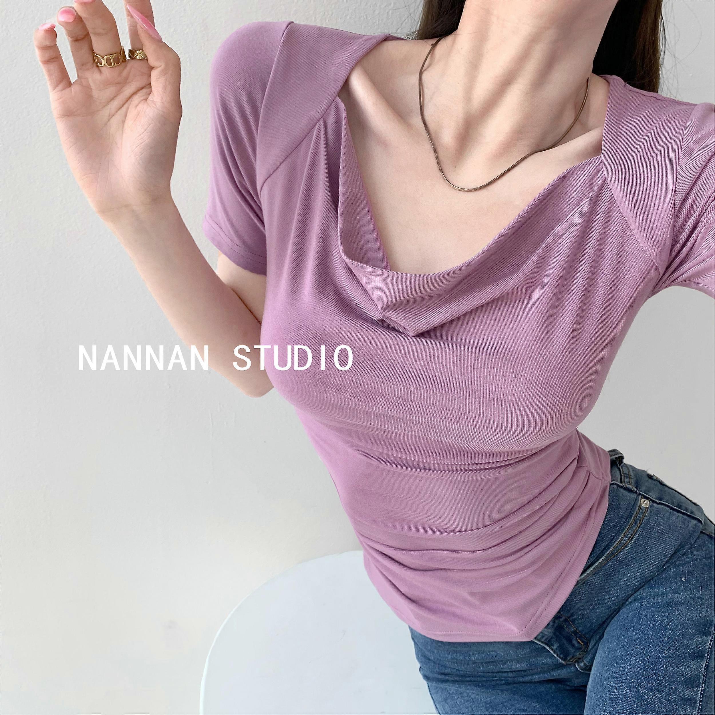 ~ Sexy Collarbone Swing Collar T-Shirt Slim Fit Pleated Waist Base Shirt Slant Bottom Short Sleeve Top