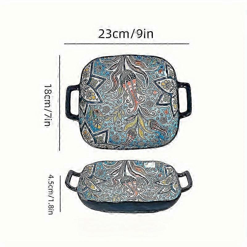 1pc, Plate, Bohemian Style Ceramic Salad Plate With Dual Handles, Oven And Microwave Safe Baking Dish For Pasta, Colorful Floral Design Tableware
