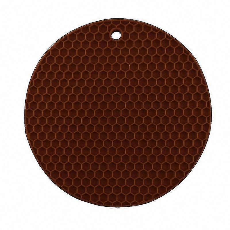 This round silicone mat with honeycombed pattern features good heat insulaiton performance and wonderful non-slip performance. 18cm in diameter, it can be used as a pan holder, can opener, spoon holder, and so on. Soft, sturdy, durable and tear-resistant, it can even be used as grip mat to open bottle caps. Feature - Color: Coffee. - Material: Silicone. - Size: 18x18cm - Honeycombed surface increases its non-slip performance and heat radiating. - Easy to clean, wash with running water and up to dry. - Can be used to place pan, can, teapot, cups, bottles, spoons and much more.