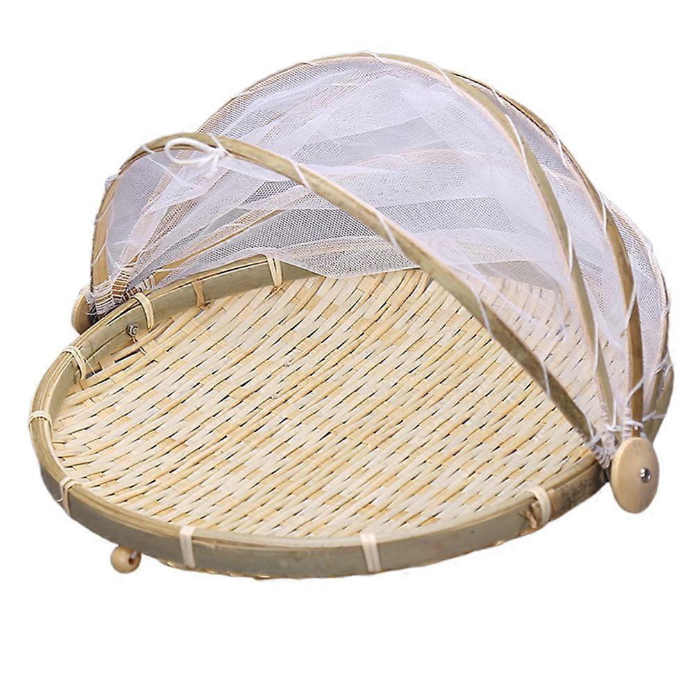 1Pc Hand Woven Basket Handmade Fruit Vegetable Bread Cover Bamboo Basket With Gauze Picnic Basket (Khaki Size S)