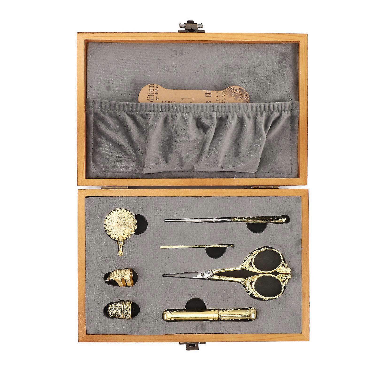 1 Set 30Pcs Vintage Sewing Box Wooden Multifunctional Sewing Kit with Shear Thread Cutter Thimble