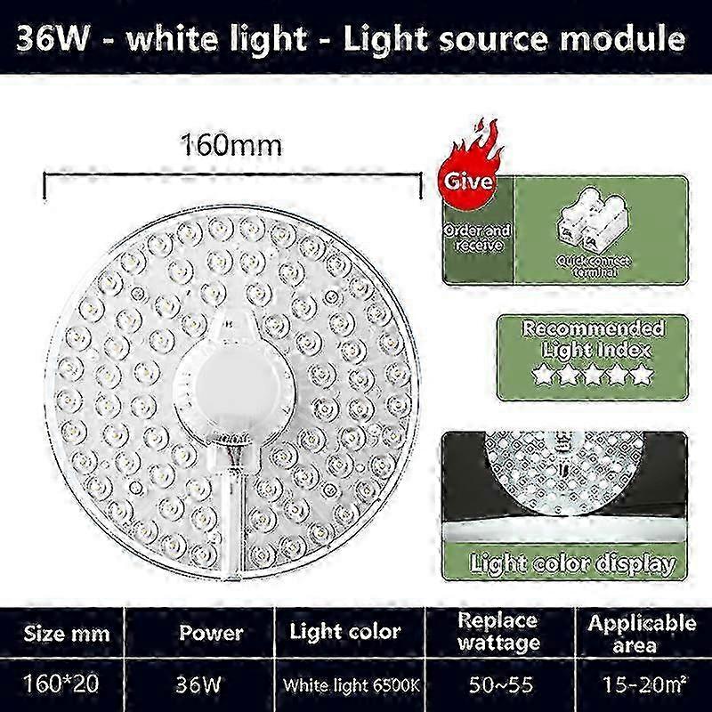 Description Type : Led Modules Emitting Color : White or 3 colors Viewing Angle : 180° Power efficiency : 12W or 18W or 24W or 36W or 48W or 72W Voltage:AC220V Luminous intensity : 1800lm Install way : Magnet Color temperature : 6500K Material: LED chip or aluminum substrate or lens lampshade Size: As picture Packaging: 1 set Super bright led ceiling light fixture: 1. Solid state, fast turn on. 2. Fast and easy installation. 3. No buzz, no flickering, no harmful mercury. 4. Stable quality transformer, short or over voltage current protection. Applicatons: 1. Living room, bedroom, kitchen, washroom 2. School, university, hospital, hotel 3. Conference, meeting room, show room, showcase 4. Hotels, restaurants classroom 5. Factory, plant, warehouse, office 6. Supermarket, department store.  Note: 1. The real color of the item may be slightly different from the pictures shown on website caused by many factors such as brightness of your monitor and light brightness. Please refer to the actual product received. 2. Please allow slight manual measurement deviation for the data. Note: Due to the light and screen setting difference, the item's color may be slightly different from the pictures. Please allow slight dimension difference due to different manual measurement.