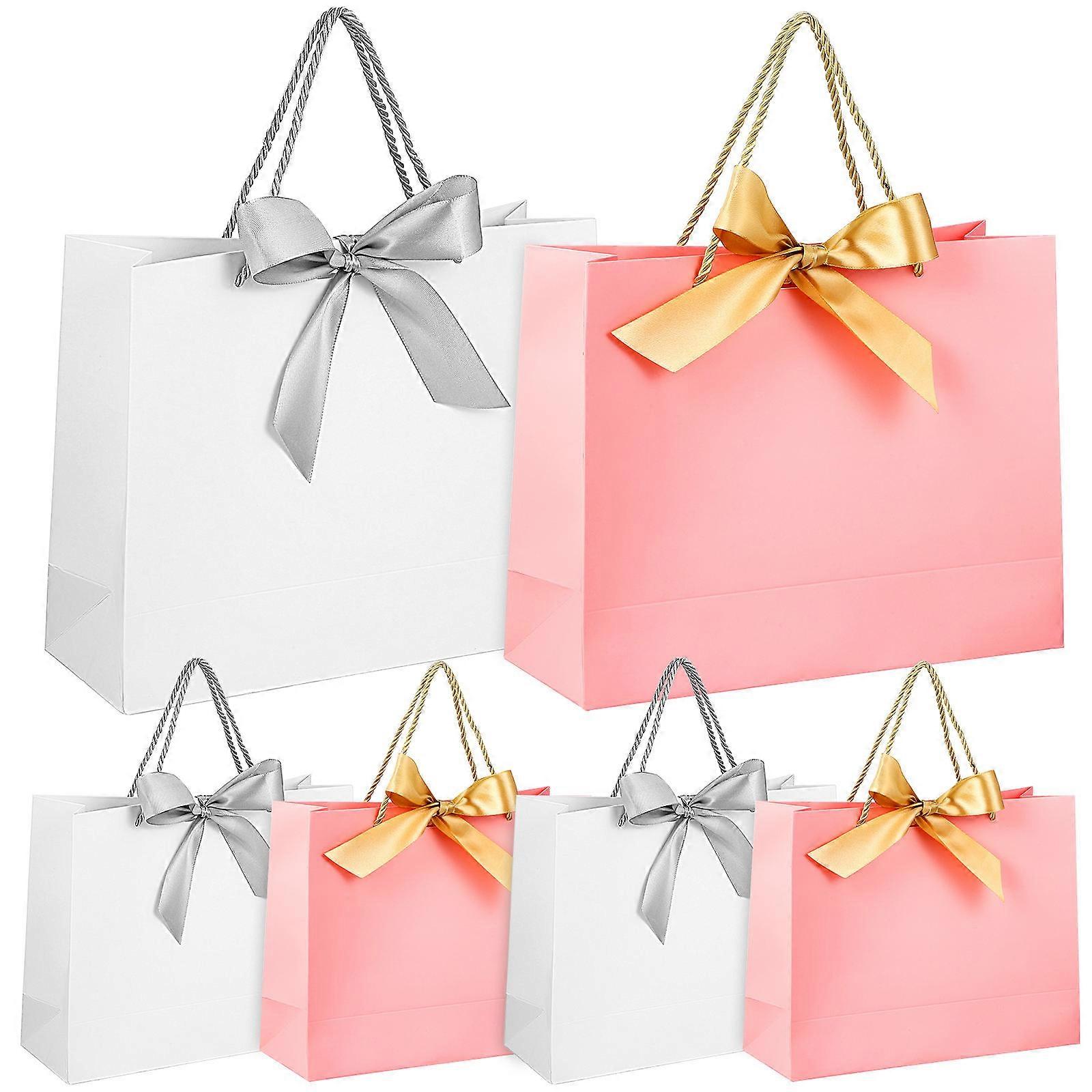 10pcs Paper Bags with Ribbon Bows, Sturdy Handles, for Weddings, Parties, Celebrations, Shopping, White & Pink with Silver Bows