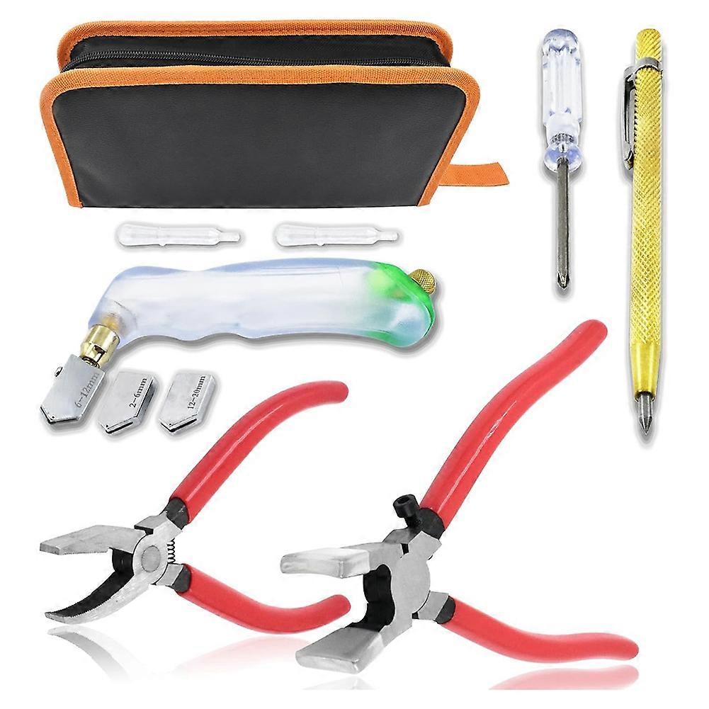 10pcs Heavy Duty Glass Cutting Tool Kit, Curve Jaw Glass Running Pliers Breaker Grozer Pliers, Pencil Style Oil Feeder