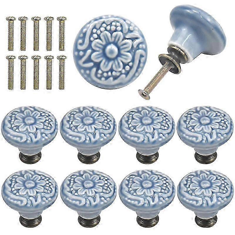 10 Pcs Ceramic Drawer Knob Vintage Engraving Round Cabinet Handle with Screws - Blue XKV