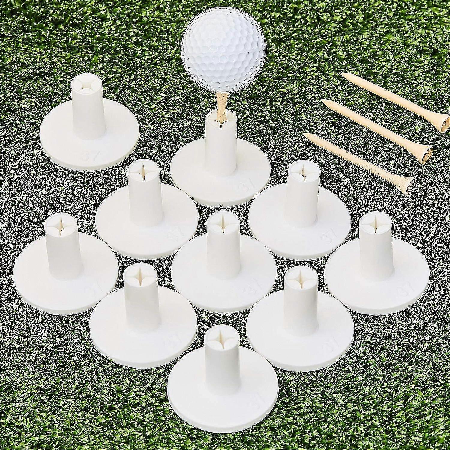 What can you get: 10 count rubber tee holders and 10 count bamboo tees, adequate quantity can support for a long time using; Golf ball is not includedQuality material: golf tee holders are made of quality rubber, which is better for indoor and outdoor practice, designed for better durability and performance, can be applied for many timesSize: height: 1.5 inch, bottom diameter: 2.1 inch; This golf rubber tee holder can easily fit most size wood tee and castle tee for indoor putting and outdoor driving range practiceFunction: with this rubber pedestal tee, it simply sits atop the tee box grass and wham, bounce after hitting the ball away but its bright white colour makes it easy to findWide range of application: golf rubber tee holder set can be applied at home, yard, etc., suitable for family and friends to play together, you can also put golf balls on the rubber tee holder directly because they can work alone10 Set golf rubber tee holder set for driving range golf practice mat indoor outdoor size 1.5 inch (10 golf rubber tee holders, 10 bamboo tees)Tee and tee holder 2 in 1:You can choose to put tees or not, both of which are very stable, allowing you to play with confidence outdoors or indoors.Cross hole design:The design of the cross hole makes the tees more stable and will not move randomly, ensuring the stability when hitting the ball and making the distance farther.Specification:Size: 1.5 inch in heightColor: as shown in the picturePackage includes:10 x Rubber tee holder10 x Bamboo teeNote:Manual measurement, please allow slight errors on size.The colors may exist slight difference due to different screens.