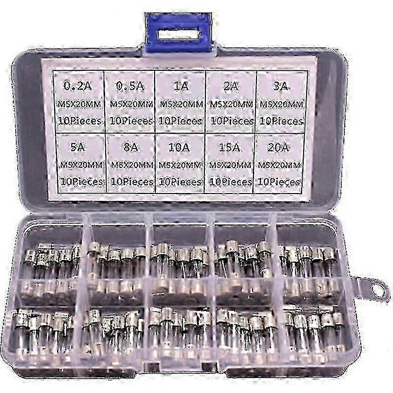 100 Glass Fuses in Box, 5x20mm Fuse Range from 0.2a to 20a for Various Applications
