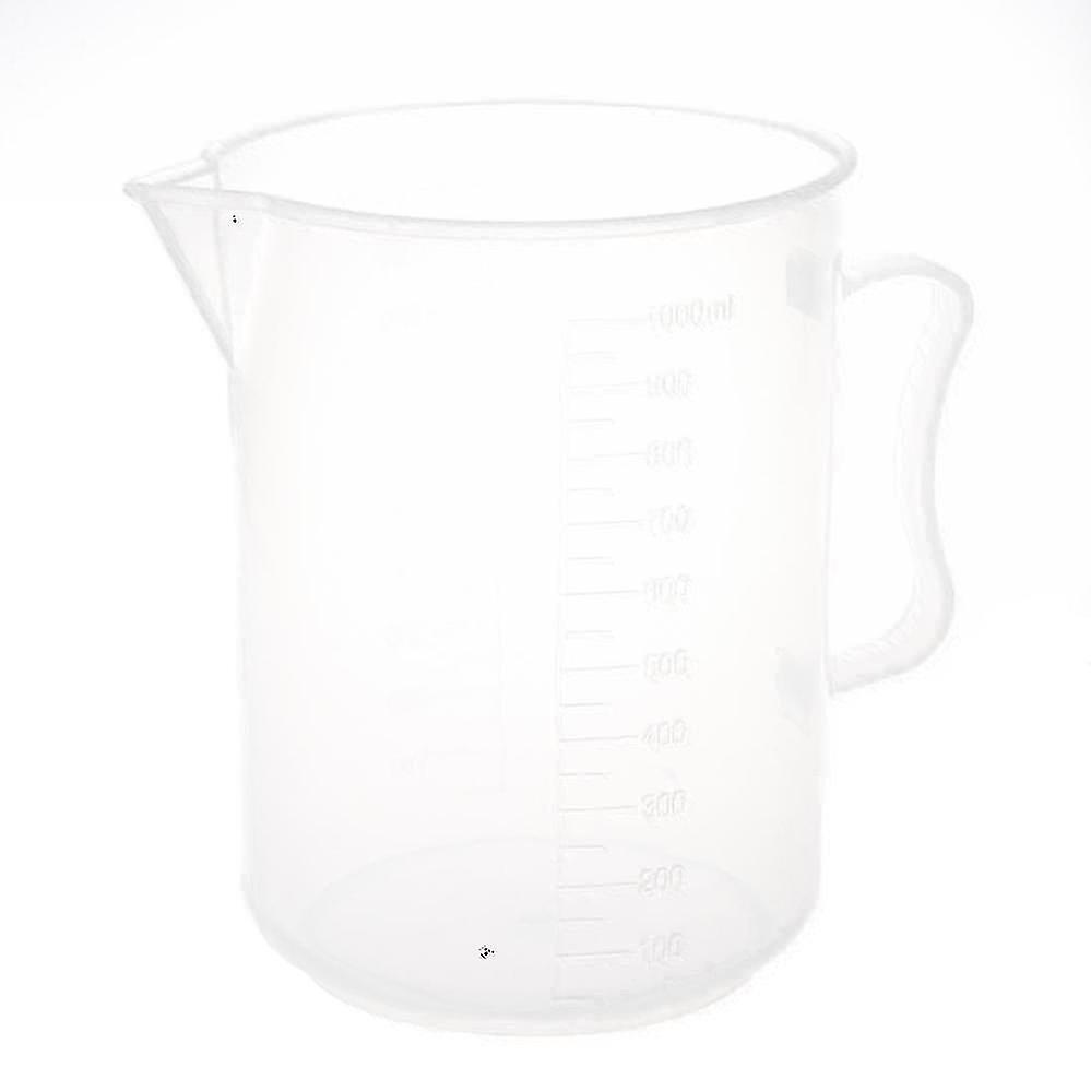 Product Name : Beaker;Capacity : 1000mLMouth Dia. : 11.1cm/ 4.3";Body Size : 14 x 10.2cm/ 5.5" x 4" (D*Bottom Dia.)Handle Size : 7.8 x 1.5cm/ 3" x 0.6" (L*W);Material : PlasticColor : Transparent;Net Weight : 72g;1000mL Capacity Clear Plastic Graduated Laboratory Measuring Set Beaker500mL beaker graduated in 50 mL increments.Raised numeric graduations from 100ml to 1000ml for easy reading.Thick wall helps to eliminate distortion.With handle design, for easy to grip.Package Content : 1 x BeakerNote:Light and different displays may cause the color of the item in the picture a little different from the real thing. The measurement allowed error is +/- 1-3cm.