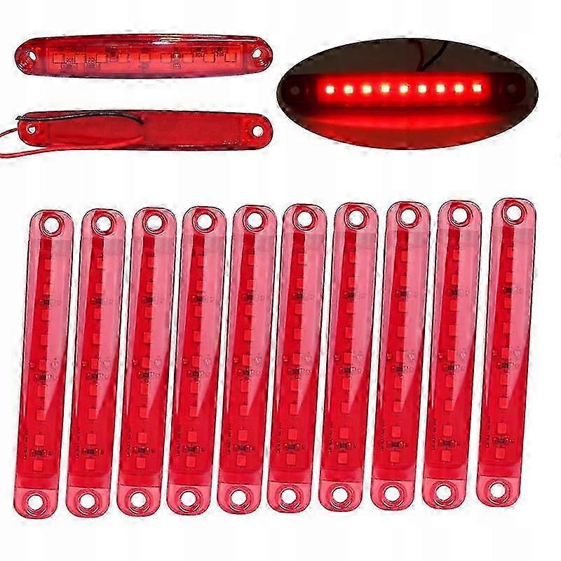 Technical data: 10 x Marker lamps(yellow) Material: ABS plastic Light source : LED Number of LEDs: 9LEDs Light color: Red Size: 100 x 14.5 x 10mm Voltage: DC 12/24V Characteristics: and in Made of material, durable and practical to use Application: Can be used for side marker lights, tail lights, turn signals, turn signals, tail lights, license plate lights, parking lights, etc.