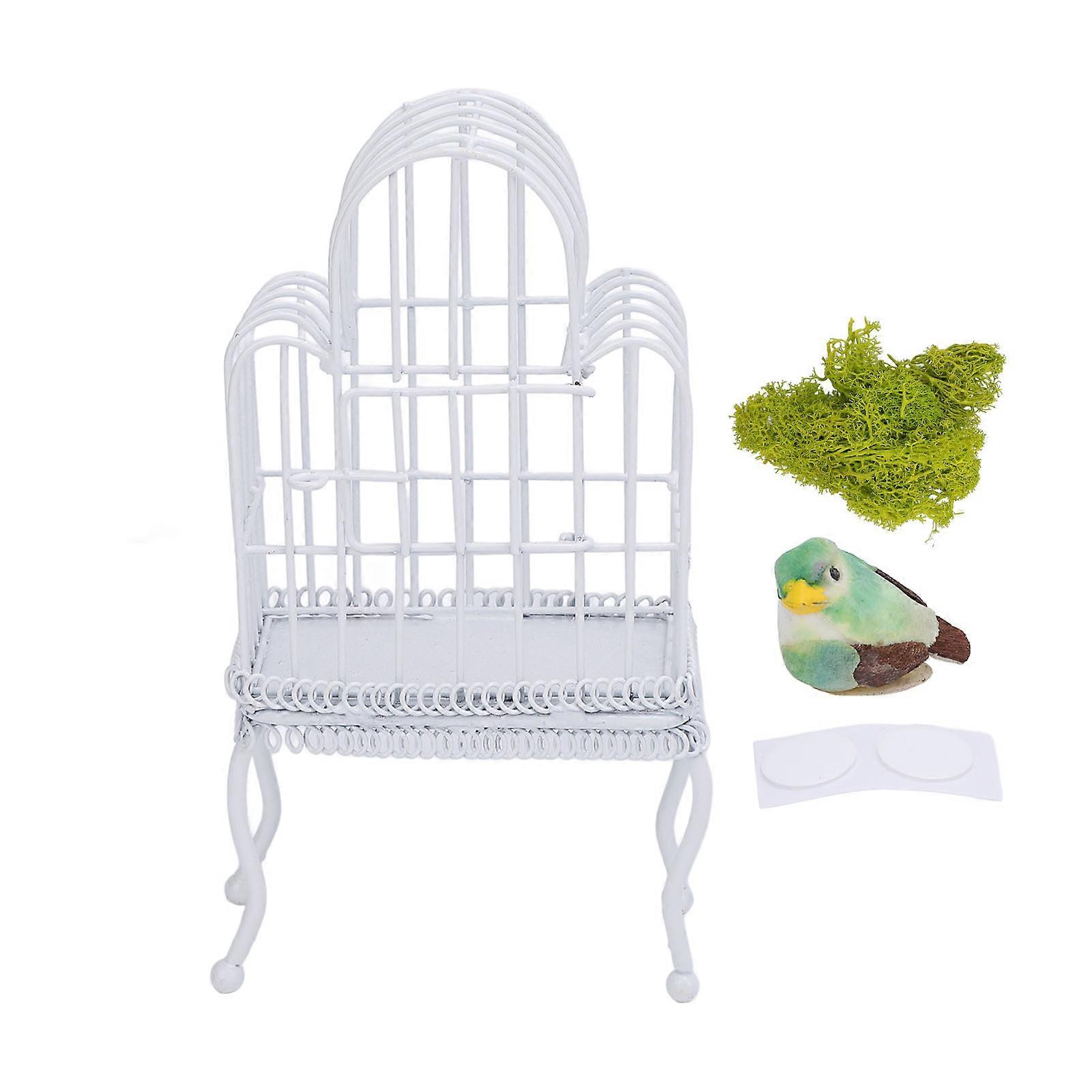 1:12 Scale Dollhouse Bird Cage Metal White, Realistic Miniature with Opening Door, Fake Grass Bird Sticker for Miniature House Decor