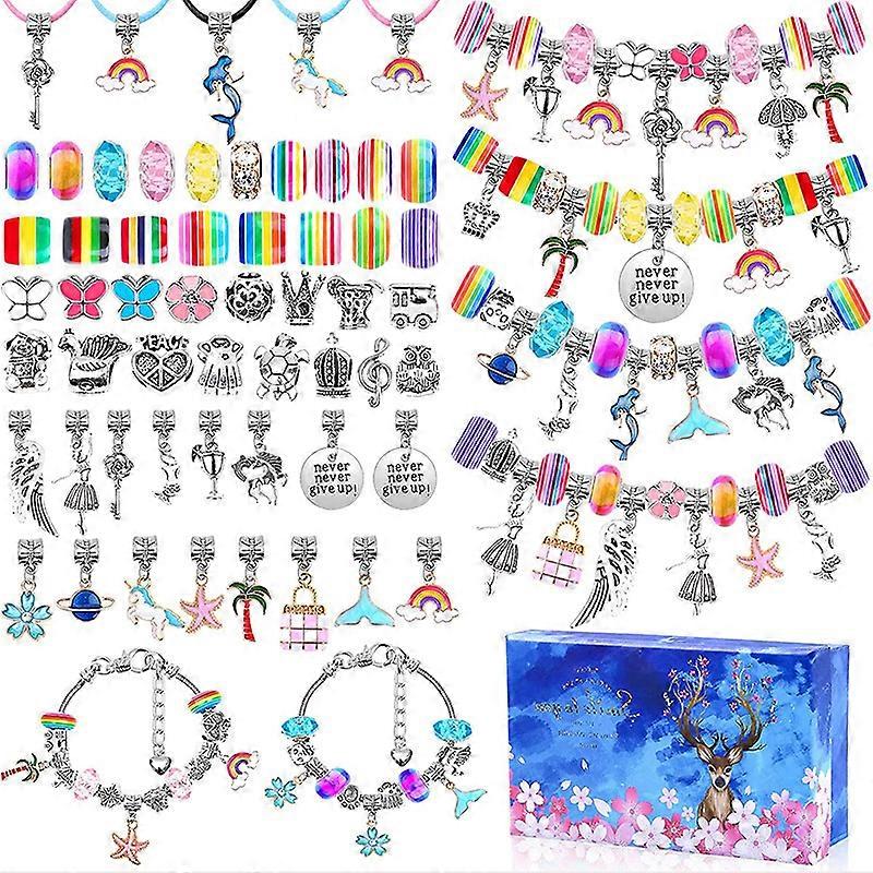 Fairy-Themed Beads:This jewelry box comes with 42 metal beads, 40 hanging beads. Your 6-12 year old kids girls will find the little magic fairy and her magic wand, the lost sandals and castle of Cinderella, the rabbit and clock of Alice's fantasy dream; the arrow of cupid, angel and her unique wings and so on. DIY Complete Bracelets:This kit includes 5 silver-plated snake chain bracelets with a length of 6.30-7.48 in, adjustable length, suitable for girls and kids over 6 years old. The orb is colorful, there are many types of pendants, and there are many choices. A starter kit for making jewelry for beginner girls and teenagers. Easy to match, fun and stylish to wear. Simple And Easy to Use:Unscrew the bracelet end cap, you can easily add, remove or replace the beads and pendants. Mix and match different glazed beads and pendants to personalize DIY and create fashionable bracelets according to different occasions and moods. Kids aged 7-10 years old can also make unique bracelets individually and give them as gifts to family and friends. Exercise Various Skills:Design colorful fairy tale bracelets that your kid love by helping yourself to help your 7 , 8, 9 year old child develop real-world skills. Visual and tactile perception capabilities, such as color matching, hand-eye coordination, divergent thinking, bold imagination, while having fun and expressing themselves The Dream Gift:All the colorful orbs, pendants and bracelets are packed in a surprisingly beautiful small bamboo gift box. It is an excellent gift for 7-12 year old girls who like DIY jewelry. Similarly, it can be an entertainment party for girls, a pajama party, a birthday party, as well as a Christmas gift, a Thanksgiving present, a Halloween gift.