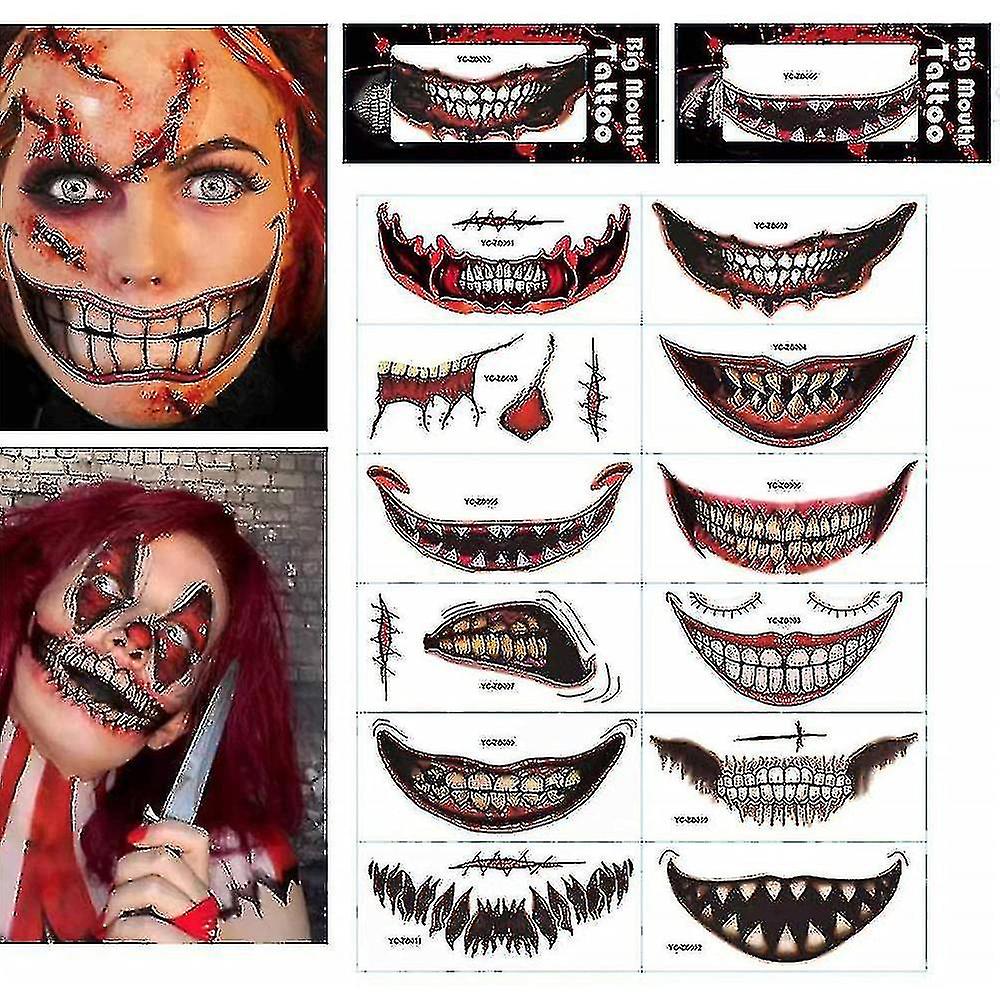 12 Pcs Halloween Graphic Tattoo Sticker Cosplay Joker Mouth Sticker