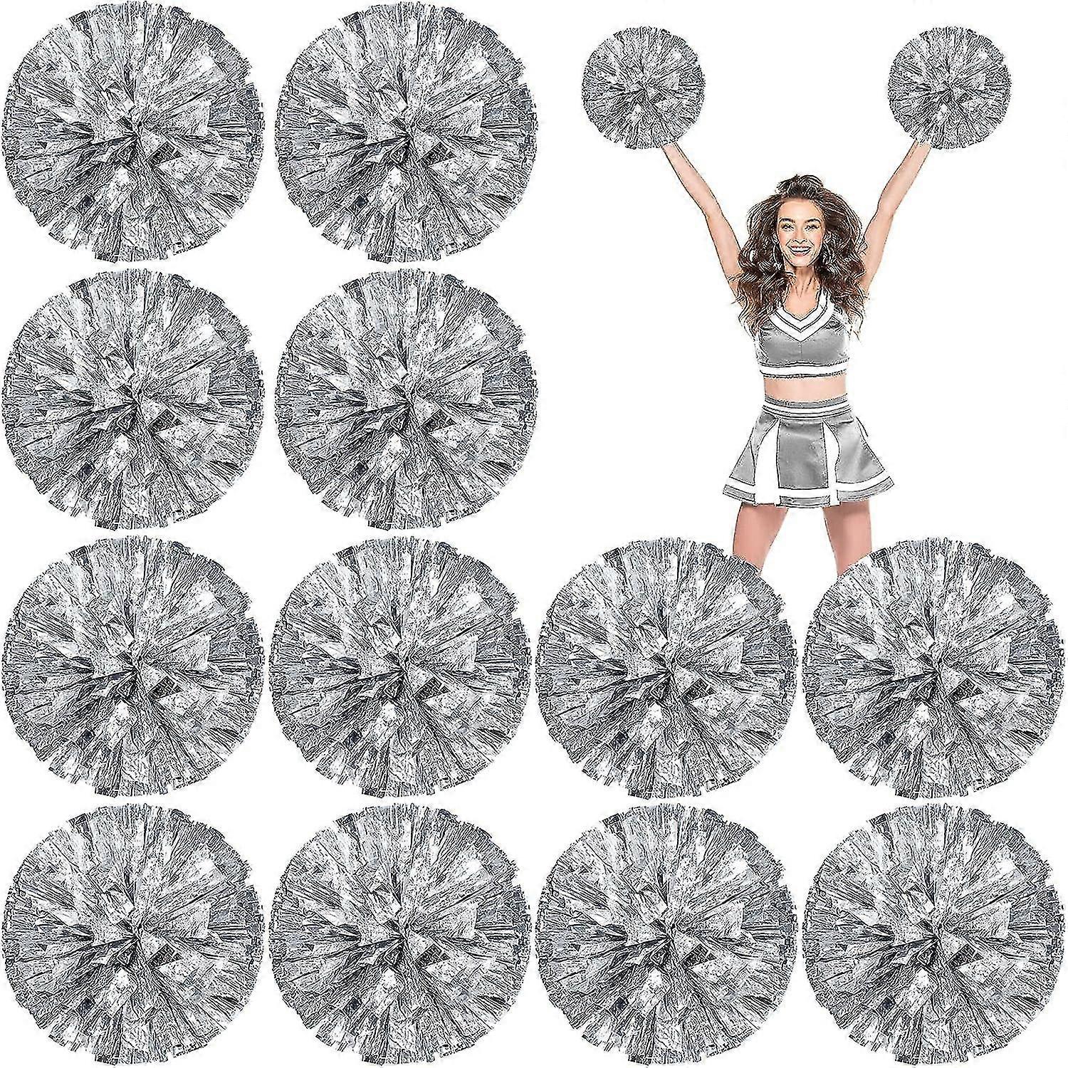 12 Pack Cheerleading Pom Poms, Metallic Foil Pom Poms With Baton Handle Cheer