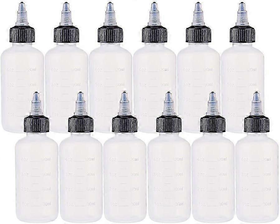 12 Pack 4 Ounce Plastic Squeeze Dispensing Bottles with Black Twist Cap and Measurement Open/Close Nozzle - Good for Crafts Art Glue Multi Purpose