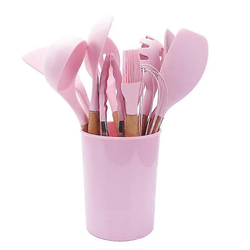 12 Pieces Wooden Handle Silicone Cooking Tools Spatula Kitchen Utensils (Pink) - DD01