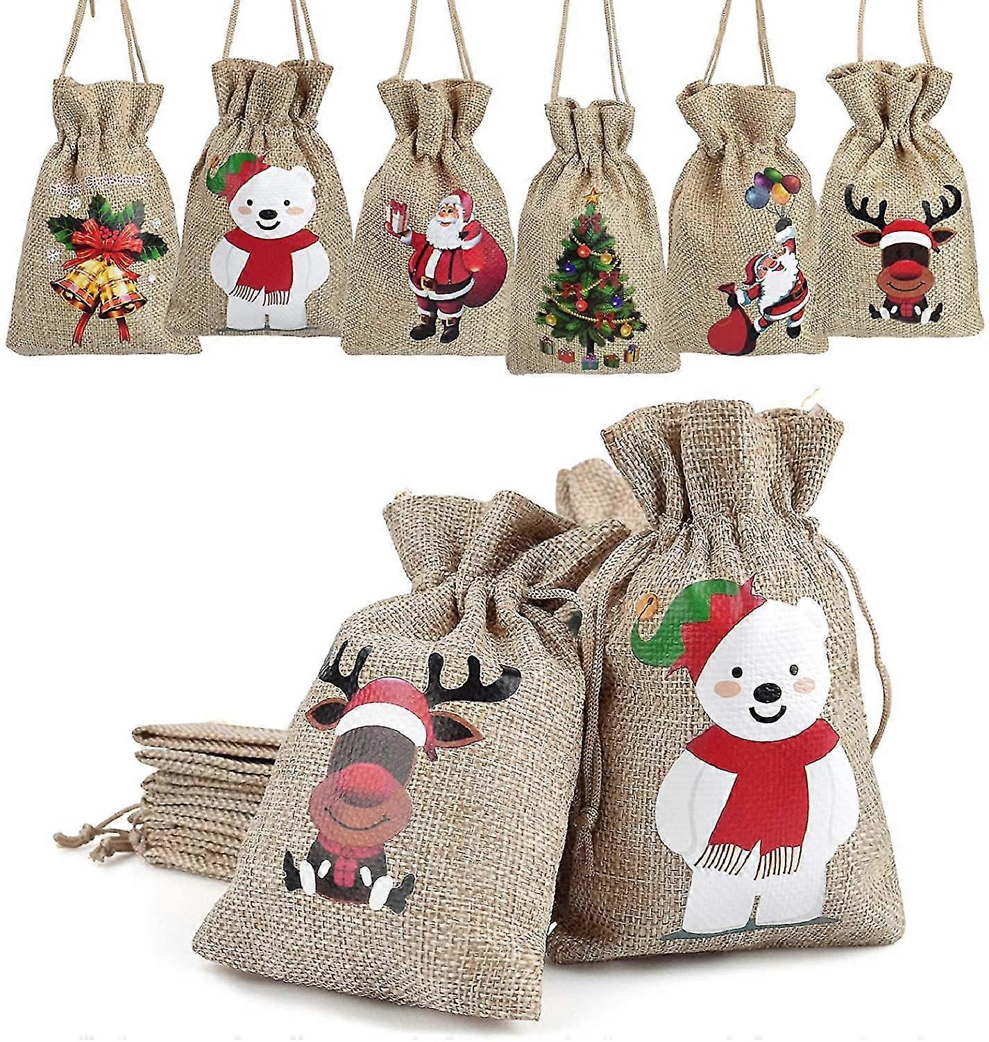 12 Pcs Christmas Rustic Linen Goody Bags Wedding Reception Small Gifts Wrap Sack Drawstring Burlap Bag Pouch For Candy, Jewelry, Chirstmas Tree Decora