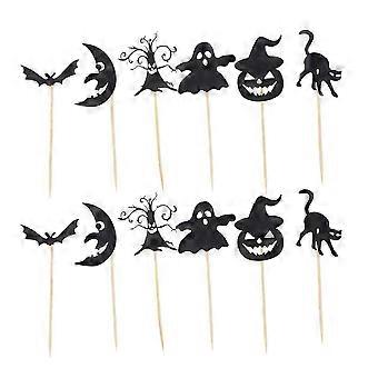 12 Pcs Halloween Cake Toppers Tree Cat Elf Moon Shaped Cupcake Toppers Fruit Dessert Picks for Halloween Festival Party Gathering (Black)