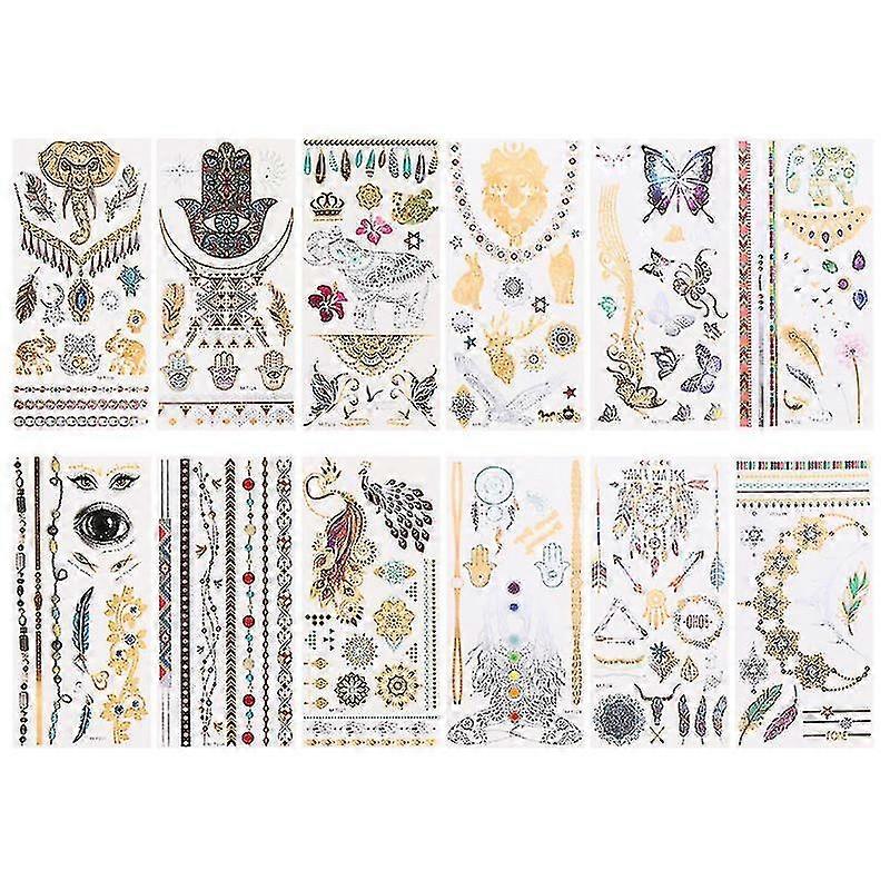 12 Sheets Waterproof Tattoos Gold Foil Stickers Temporary Tattoos Body Stickers