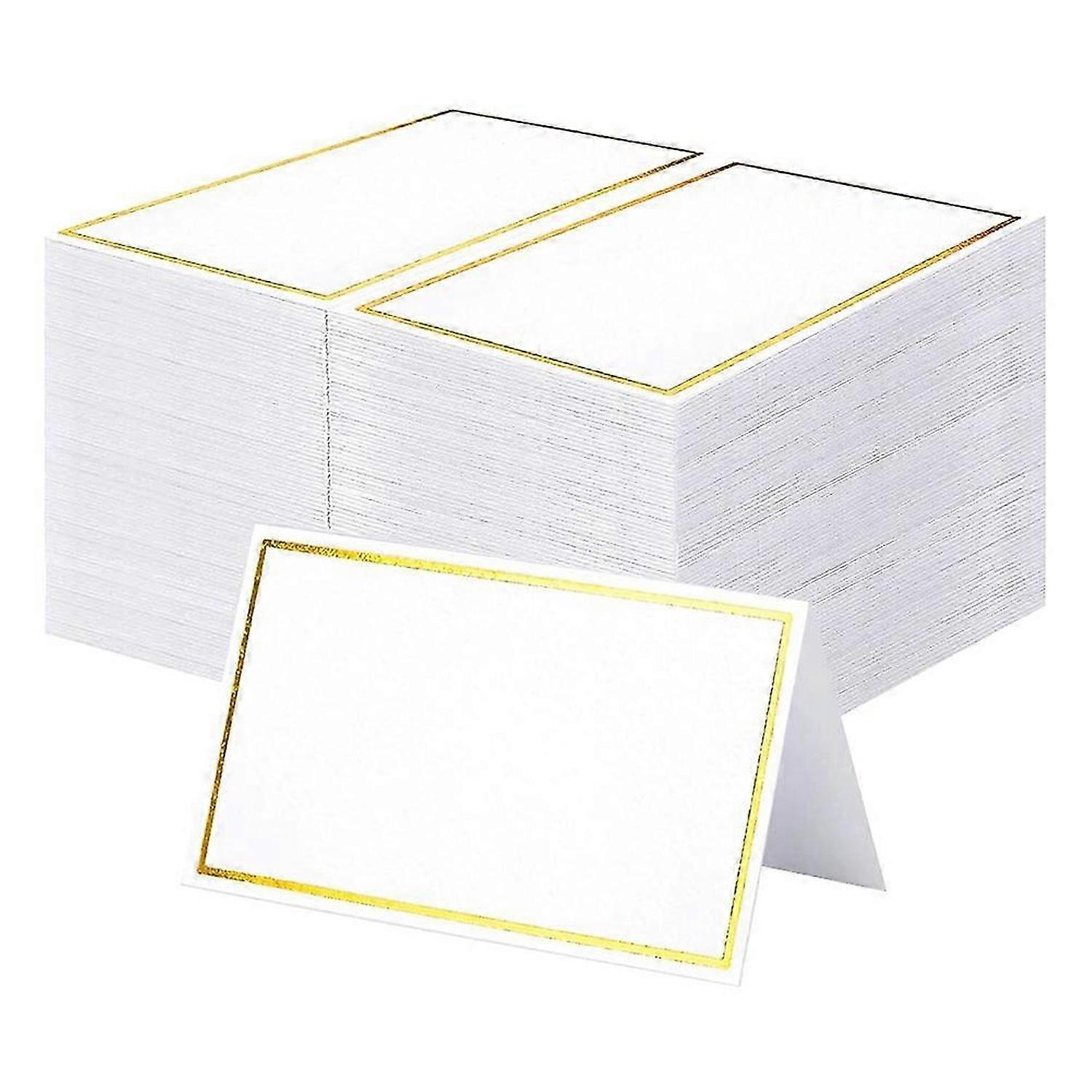 Luxurious Appeal: Impress your guests with 120 premium place cards adorned with elegant gold foil borders. Crafted from 300 gsm thick paper, these cards boast a sturdy, high-quality construction and a textured, matte finish for easy writing and quick drying. Elegant Design: Featuring a sophisticated gold foil frame, these place cards exude luxury and can stand independently on tables. Perfect for adding of class to any setting, their self-standing design is convenient for any formal event. Optimal Size: Each folded card measures 3.5 x 2 inches, providing ample space for personalization. Unfolded, they extend to 3.5 x 4 inches, offering plenty of room for guest names and table numbers, ensuring clear and elegant seating arrangements. Versatile Use: Ideal for occasions including weddings, banquets, dinners, and holiday parties. These cards also well at birthdays, bridal showers, and anniversaries, enhancing the decor and organization of your event. Multi-Functional: Beyond seating arrangements, these cards are perfect for labeling food at banquets, describing products at markets, and even as thank you or greeting cards. Their versatility makes them an essential for any host.<br><br>Colour:White Material:Paper Size:Unfolded size: . 9 x 10cm<br><br>Package Contents: 120 x place cards<br><br>Only the above package content, other products are not included. Note: Light reflection and different displays may cause the color of the item in the picture a little different from the real thing. The measurement allowed error is +/- 1-3cm.