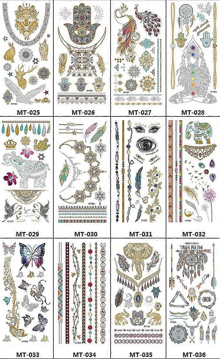 12pcs Metallic Temporary Tattoos Gold Silver Temporary Tattoos Glitter Shimmer Designs