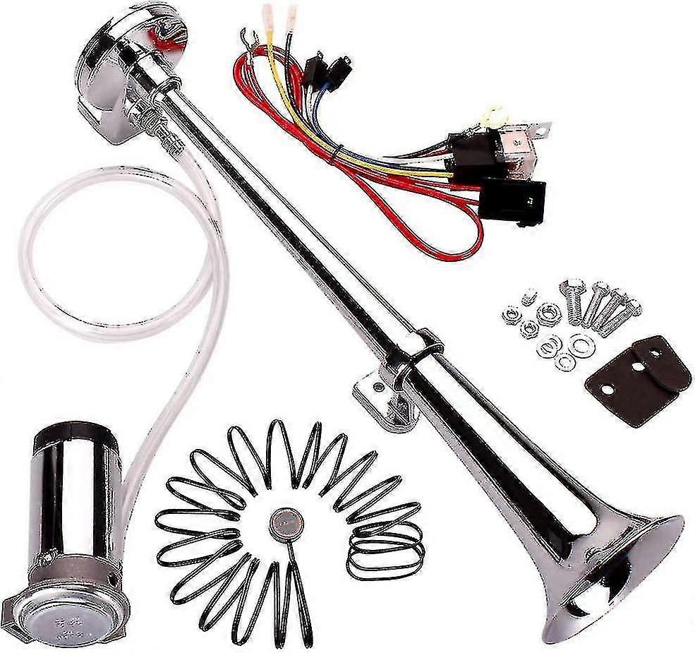 High Volume:It can produce 150dB of strong sound,When you drive, no one will ignore the sound,making driving more safer. High quality: The air horn is made of high quality chrome-zinc plating material, which ensures durability and service life and can work in various temperature environments. Easy to install: Our speaker suite is very easy to install, You can install it manually with the harness package we distribute. Suitable for any 12V vehicle type, including car,truck, SUV,RV,motorcycles off road Independent control: Button switch can control the speaker separately, so that you can choose to use the speaker or your original car horn in different driving environments. matters needing attention: one line of the button connects to the blue line (or white line) of our wiring harness, the other line of the button connects to the battery positive line, and the white line(or blue line) in the wiring harness connects to the frame. These are easy to connect wrong, resulting in the relay does not work.Please check it carefully! Item Dimensions :LxWxH 17.5 x 4.33 x 3.94 inches