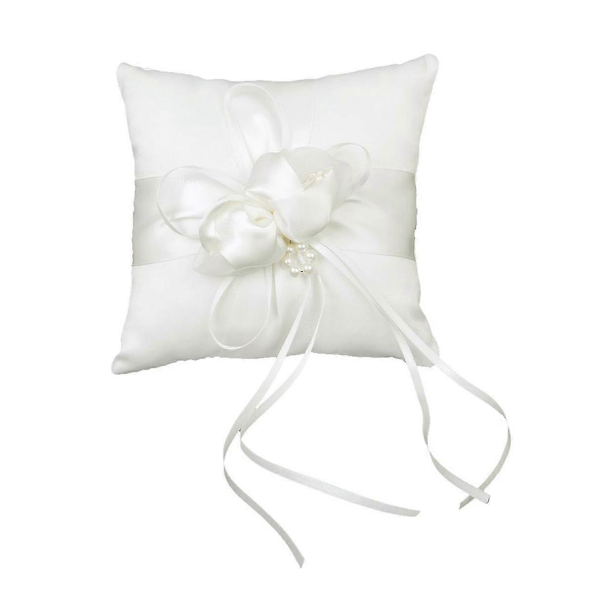 15*15cm Lovely Flower Buds & Faux Pearls Decor Bridal Wedding Ceramony Pocket Ring Pillow Cushion Bearer with Ribbons (White)