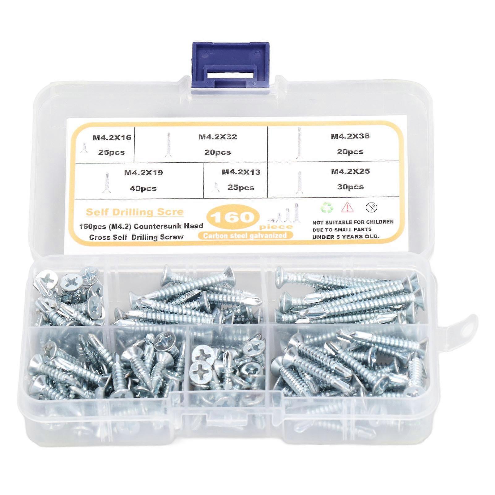 160Pcs Self Drilling Screws Carbon Steel Blue Zinc Plated Countersunk Cross Head Fastener M4.2 for Wood
